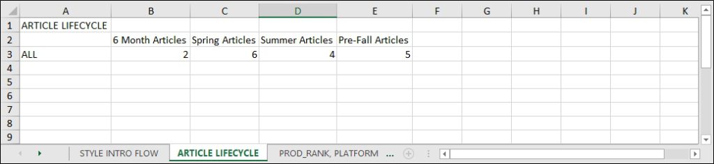 ARTICLESInputted from TargetsSum from Line Builder – total of “Total Articles”(SS20-SS19)/SS19Inputted from Targets(SS20-TRGT)/TRGT
