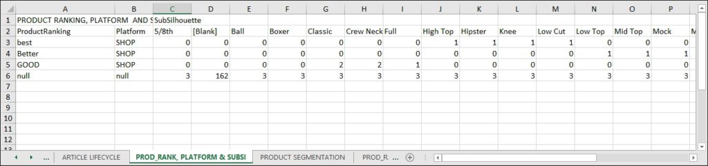 Product ranking for platform #1 and SubSilhouette #1: